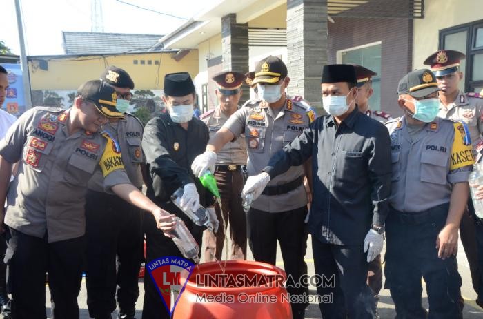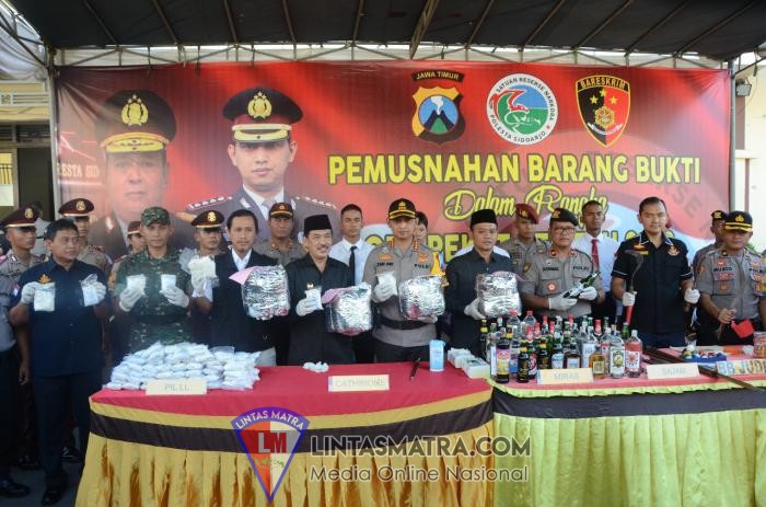 LINTAS MATRA.COM SIDOARJO. Menjelang Hari Raya Idul Fitri 1440 Hijriyah, Polresta Sidoarjo menggelar Apel Pasukan Operasi Ketupat Semeru 2019, di lapangan Polres Sidoarjo , Selasa (28/5). Apel di pimpin oleh Kapolresta Sidoarjo Kombes Pol Zain Dwi Nugroho, hadir juga Wakil Bupati Sidoarjo Nur Ahmad Syaifuddin, Ketua DPRD Sidoarjo Sulamul Hadi Nurmawan, Kepala BPBD Sidoarjo Dwidjo Prawito, Kodim Sidoarjo. Sekaligus memusnahkan Barang Bukti miras sebanyak 2.500 botol dari berbagai merk, 612 Mercon, Narkotika jenis daun cathinone seberat 8 kg, Pil dobel L 116.000 Butir, Berhasil mengungkap 451 Kasus dan sebanyak 476 tersangka yang diamankan,Ucap Zain. Kapolresta Kombes Pol Zain Dwi Nugroho menyampaikan, apel gelar pasukan sebagai wujud persiapan Polri dalam menghadapi kegiatan pengamanan hari raya idul fitri, serta sebagai sarana untuk solidasi dan pengecekan personil peserta kelengkapan sarana dan prasarana sebelum menghadapi tugas dilapangan.