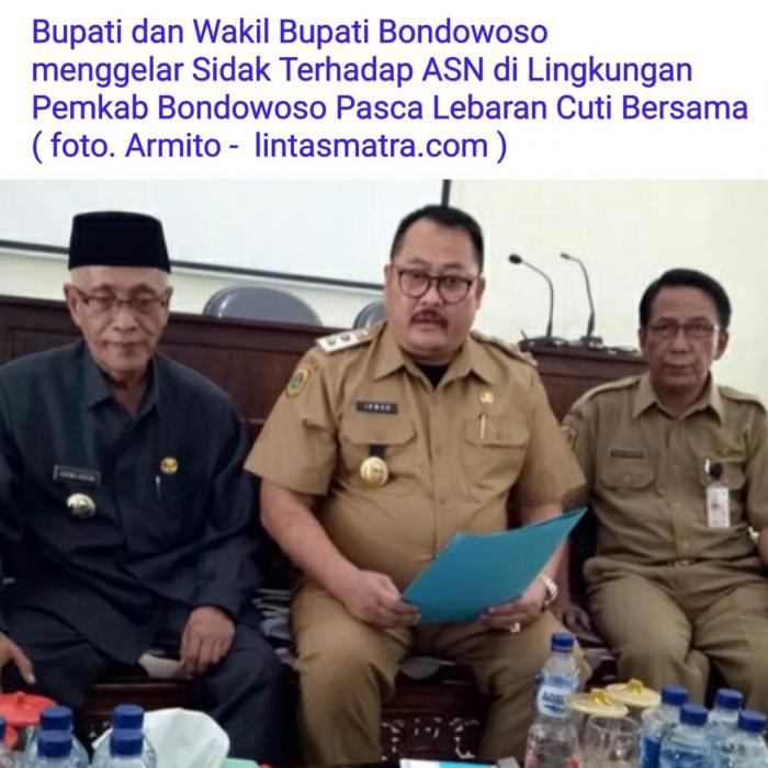 LINTASMATRA.COM – BONDOWOSO. Pasca Lebaran hari pertama masuk kerja setelah cuti lebaran 2019, Bupati dan Wakil Bupati (Wabup) Bondowoso menggelar Operasi Mendadak (Sidak) ke beberapa instansi pemerintahan di lingkungan Pemerintah Kabupaten (Pemkab) Bondowoso, Senin (10/6/2019). Hal tersebut dilakukan untuk mengetahui tingkat kedisiplinan Apatur Sipil Negara (ASN) melalui kehadiran di hari pertama masuk kerja. Sesuai Peraturan Pemerintah (PP) nomor 53 tahun 2010 tentang disiplin PNS. Diterangkan, dihari pertama masuk kerja pasca cuti lebaran, ASN yang tidak masuk atau membolos akan mendapat sanksi baik sanksi ringan, sedang, dan berat, yang Disampaikan, Wakil Bupati (Wabup) Bondowoso, Irwan Bachtiar Rahmat. Kedisiplinan kehadiran ASN di lingkungan Pemkab setempat tahun ini mengalami peningkatan dibanding tahun sebelumnya hingga 98,99 persen.