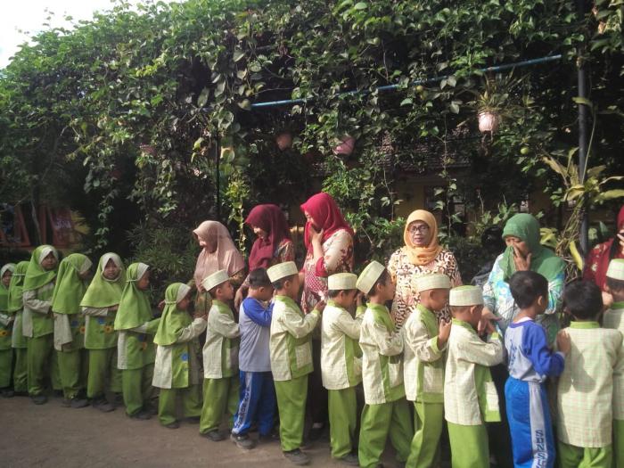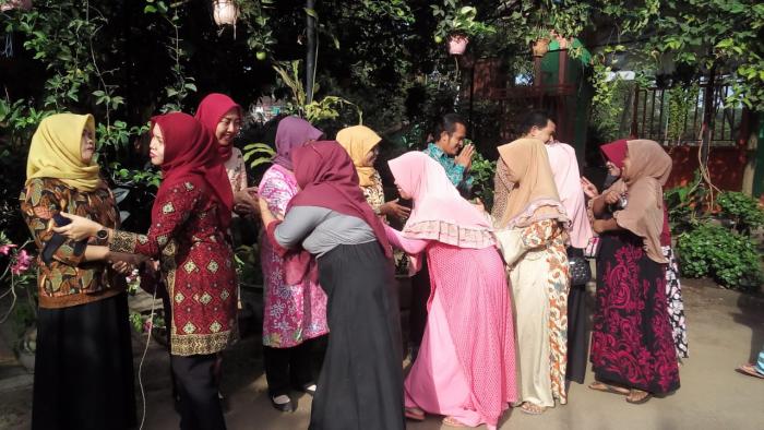 Guru, murid bersama orang tua wali murid memanfaatkan momen Idul Fitri 1440 Hijriyah untuk bermaaf – maafan. Bertempat di halaman sekolah tampak suasana haru dengan penuh keakraban ketika saling berjabat tangan di antara mereka.