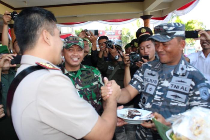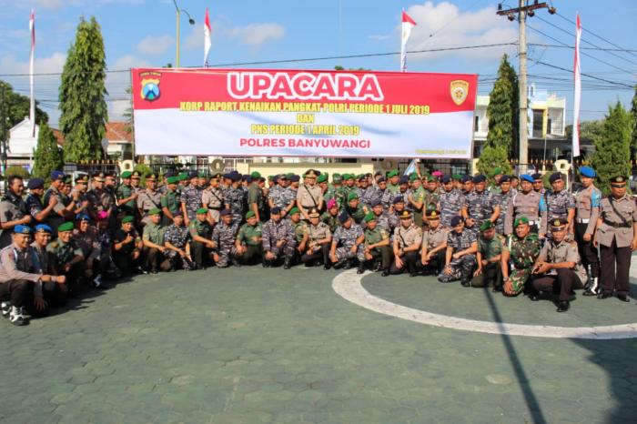 LINTASMATRA.COM – BANYUWANGI. Danlanal Banyuwangi , Lantamal V, Koarmada II, Letkol Laut (P) Yulius Azz Zaenal, S.H., M.Tr. Hanla menghadiri Upacara Kenkat Anggota Polres Banyuwangi , Ucapan selamat HUT Dirgahayu Bhayangkara ke -73 datang dari Kodim 0825 Banyuwangi dan Lanal Banyuwangi yang dipimpin oleh Dandim 0825 Banyuwangi Letkol Inf Ruli Nuryanto, dikuti Seluruh Prajurit, Senin (1/7). Dengan membentangkan spanduk bertuliskan Dirgahayu Bhayangkara Ke 73 Dengan Semangat Promoter Pengabdian Polri Untuk Masyarakat, Bangsa Dan Negara, para prajurit Kodim 0825 Banyuwangi serta prajurit Lanal Banyuwangi ini memasuki halaman Mapolres Banyuwangi .