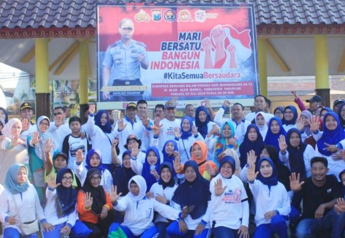 Masyarakat Kabupaten Pasurun mengucapkan selamat kepada Kepolisian Negara Republik Indonesia pada usia ke-73. Kita berharap di usia yang ke 73 mempunyai polisi yang promoter (profesional modern terpercaya),” tutur masyarakat yang mengikuti senam bersama. Kapolres Pasuruan AKBP. Rizal Martomo., S.I.K., M.H., menyampaikan pagi hari ini melaksanakan rangkaian kegiatan menyambut Bhayangkara Ke 73 tahun 2019, untuk hari ini khusus kegiatan olahraga bersama Polri dan Masyarakat. Polres Pasuruan telah bersama-sama melaksanakan pengamanan terkait pilpres, pileg hingga pengamanan mudik Lebaran. Sehingga wilayah kabupaten Pasuruan Kondusif”, ujar Kapolres. Kegiatan selain senam Bersama, digelar juga Deklarasi Dalam Menjaga Kondusifitas Bangsa Indonesia Terutama Di Wilayah Hukum Kabupaten Pasuruan.
