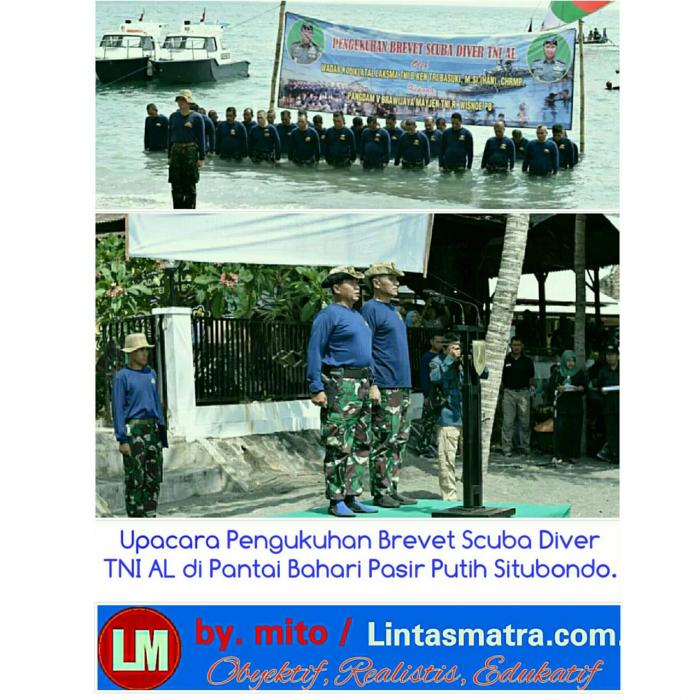 LINTASMATRA.COM – SITUBONDO. Pelaksanaan upacara pengukuhan, Wadankodiklatal Laksma TNI B Ken Tri Basuki, M.Si (Han) bersama Pangdam V/Brawijaya Mayjen TNI R.Wisnoe Prasetija Boedi, di gelar di Pantai Wisata Bahari Pasir Putih ( Pasput ) Situbondo.”Sabtu (20/7/2019) Acara Upacara tersebut dihadiri Kapolres Situbondo, AKBP Awan Hariono, S.H., S.I.K., M.H. Dandim 0823 Situbondo,” Juni Toha….Forkopimda Pemkab Situbondo. Mayjen TNI R. Wisnoe Prasetija Boedi mengucapkan terima kasih kepada Kapolres Situbondo, Dandim 0823 Situbondo, Forkopimda Situbondo, atas bantuannya dalam mendukung pelatihan selam dasar scuba dasar TNI AL di Pasir Putih.