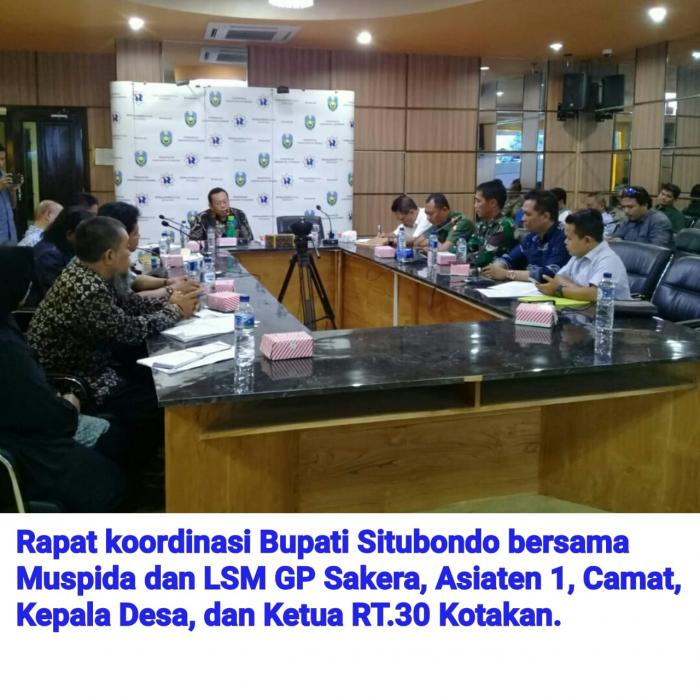 LINTASMATRA.COM – SITUBONDO . Problema yang terjadi terkait Peraturan Daerah (Perda) No 27 Tahun 2004, tentang larangan prostitusi Pelacuran lokalisasi di Kabupaten Situbondo, yang telah disoal oleh Aktivis LSM GP Sakera Kabupaten Situbondo. Menyikapi hal tersebut, Bupati Situbondo” H.Dadang Wigiarto, SH. Melakukan koordinasi dengan Muspida, LSM Sakera Yang bertempat di Intellegence Room ( IP ) lantai 2 kantor Pemkab Situbondo.Jumat, (26/07 ), Pukul 09.00 Wib. Rapat koordinasi di pandu langsung oleh Bupati Situbondo,” Dadang, yang dihadiri perwakilan Kapolres Situbondo, Perwakilan Kodim, Perwakilan CPM, Ketum GP Sakera, Asisten I, Kasatpol PP, Camat Kota, Kepala Desa Kotakan, dan Ketua RT 30 RW.11 Kotakan Situbondo.