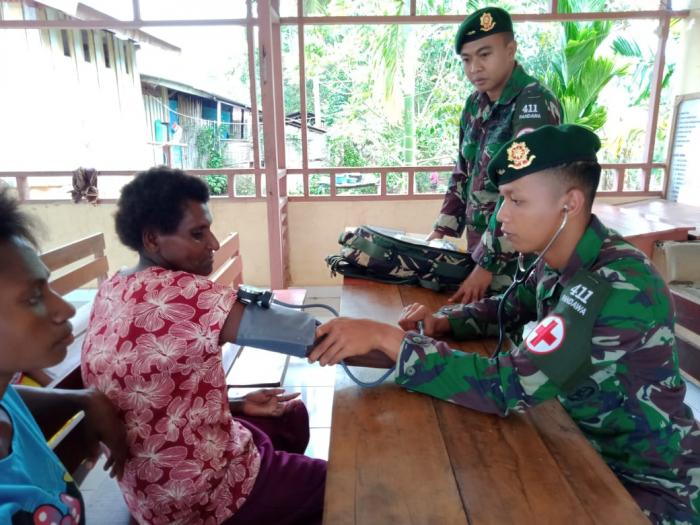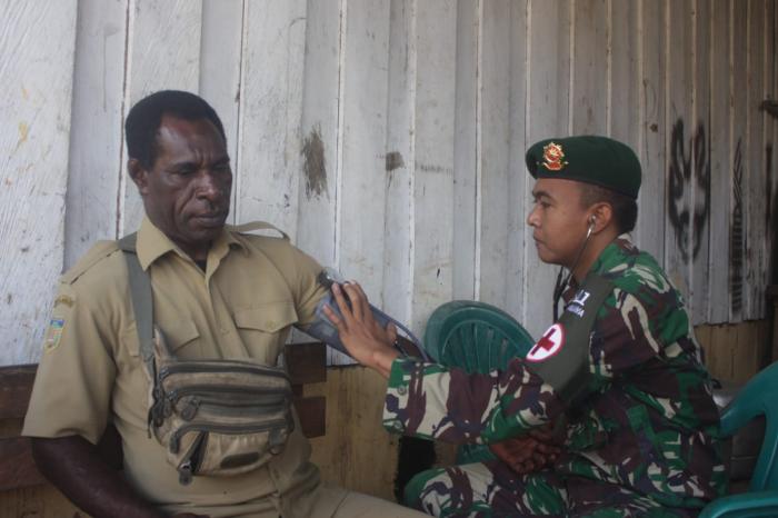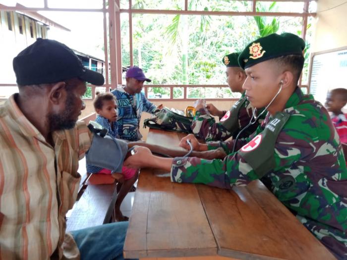 Kita (Satgas) berinisiatif menyelenggarakan layanan kesehatan gratis kepada warga yang kita pusatkan di balai kampung Erambu,’’ ujarnya. Kegiatan yang dimulai pada Minggu, (4/8/2019) tersebut, dipimpin langsung oleh Serka Abdul Wahab, yang sehari-hari menjabat sebagai Bintara Kesehatan (Bakes) Pos Kaliwanggo, dimulai pukul 09.00 WIT hingga 17.00 WIT.