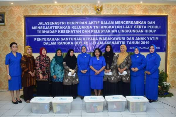 LINTASMATRA.COM – SURABAYA. Menjelang peringatan puncak HUT ke-73 Jalasenastri pada 27 Agustus mendatang, Ketua Korcab V DJA II Ny. Yoeliana Tedjo Sukmono memimpin menyerahkan santunan kepada Warakawuri (janda prajurit TNI) dan Anak Yatim di Aula Korcab V, Mako Lantamal V, Surabaya, Selasa (20/8). Tampak hadir Wakil Ketua Korcab V DJA ll Ny. CTO Sinaga, Pengurus dan Pabinhar Korcab V, Ketua Cabang l, Cabang 2 dan para Ketua Ranting A s/d K Cabang 1 Korcab V lainnya. “Pada hari ini kita berkumpul untuk melaksanakan penyerahan santunan kepada Warakawuri dan anak yatim dalam Rangka Rangkaian Hari Ulang Tahun ke 73 Jalasenastri Tahun 2019, semoga bermanfaat,” terang Ketua Korcab V ini.