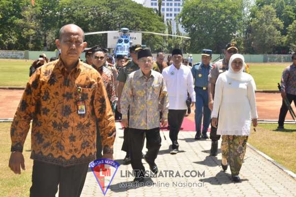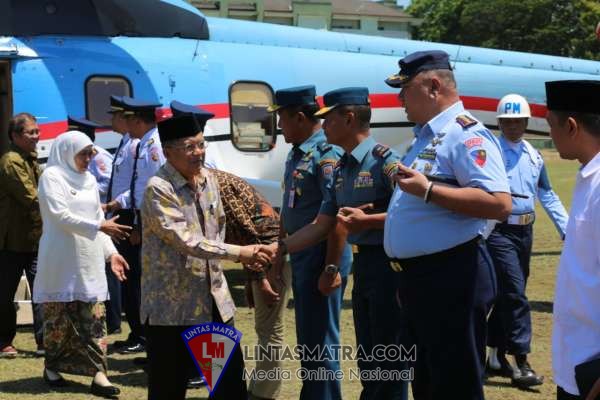 Kedatangan Wapres RI yang didampingi Ibu Mufidah Jusuf Kalla dan Menkominfo Rudiantara beserta rombongan di Makodam V Brawijaya ini, tiba pukul 10.00 wib dengan mengunakan Helikopter VVIP Super Puma TNI AU setelah sebelumnya mengunjungi Pondok Modern Darussalam Gontor, Ponorogo.
