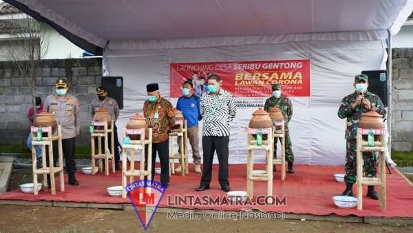 LINTASMATRA – MALANG. Kapolres Malang bersama Fokopimda Kab. Malang melaksanakan giat Launching Desa Seribu Gentong Lawan Corona di Desa Kuwolu, Kecamatan Bululawang, Kabupaten Malang. Kamis (9/4/20).