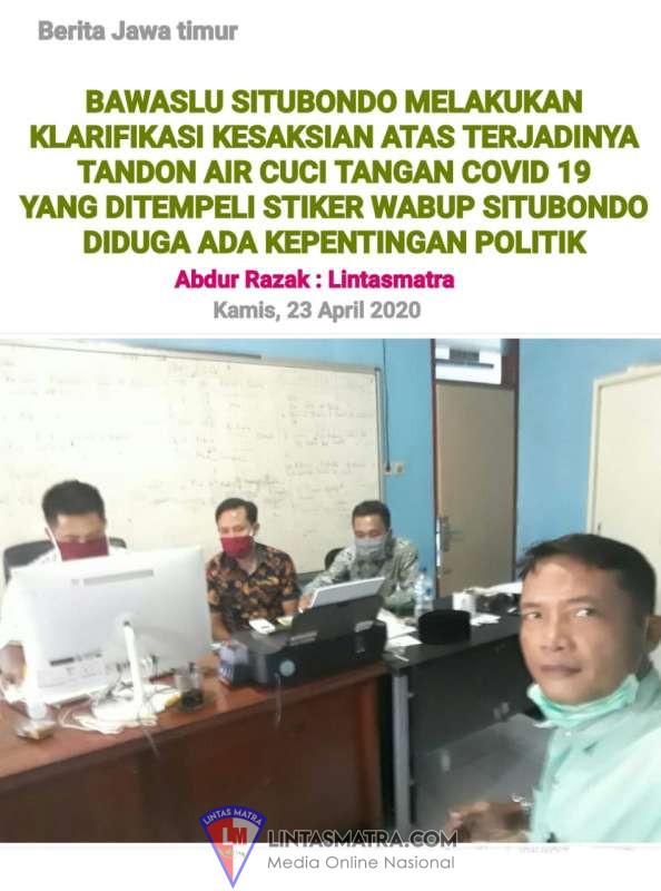 LINTASMATRA.COM – SITUBONDO. Miris melihatnya bantuan Tandon air cuci tangan Covid 19 dari Forkopimda diduga bernuansa politik, LSM Transparansi akhirnya melapor ke Bawaslu Kabupaten Situbondo. Selasa, 21/4/2020
