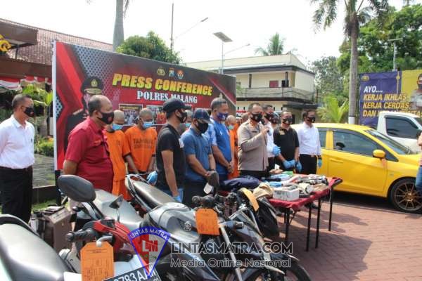 Dari hasil penangkapan tersebut, Sat Reskrim Polres Malang berhasil mengamankan sejumlah baran bukti berupa : 1 (satu) unit mobil Grandmax warna putih Nopol: N-8602-BI, 1 (satu) unit sepeda motor Yamaha Mio warna putih No. Pol: N4326-CV, 1 (satu) unit sepeda motor Honda Beat warna merah putih No. Pol :N-3783-AAW, 1 (satu) unit sepeda motor Honda Sonic warna hitam No. Pol: N3967-AAY, 1 (satu) unit sepeda motor Yamaha Vixion warna hitam No. Pol N-4292-AAU, Batu bata dan 6 (enam) pakaian yang digunakan pelaku.