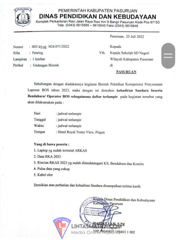 Jumat, 4 November 2022 sejumlah awak media melakukan penelusuran terkait adanya pelaporan sejumlah LSM terhadap Bimbingan Teknik ( BINTEK) kompetensi penyusunan laporan BOS Tahun 2023, yang diselenggarakan di Royal View’ Hotel sejak tanggal 8 Agustus sampai dengan 3 September 2022, oleh Dinas Pendidikan dan Kebudayaan Kab. Pasuruan