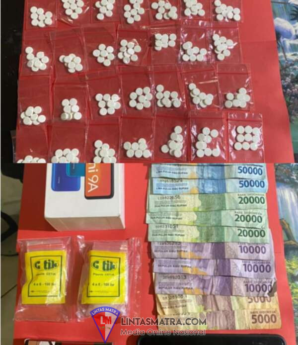 Dari tangan pelaku,Polisi berhasil mengamankan barang bukti berupa: 401 (empat ratus satu) Butir pil logo Y warna putih, Uang tunai Rp. 350.000,- (tiga ratus lima puluh ribu rupiah), 1 (satu) Unit HP merk Redmi 9A warna biru, 2 (dua) Pack plastic klip, 1 (satu) bungkus Rokok Merk Marlboro, 1 (satu) dosbox hp merk Redmi 9A.