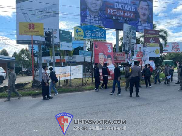 Satgas Operasi Mantap Brata Polres Kubu Raya dampingi Bawaslu Kabupaten Kubu Raya dalam kegiatan penertiban Alat Peraga Sosialisasi (APS) yang menyerupai Alat Peraga Kampanye (APK), seperti poster dan spanduk.