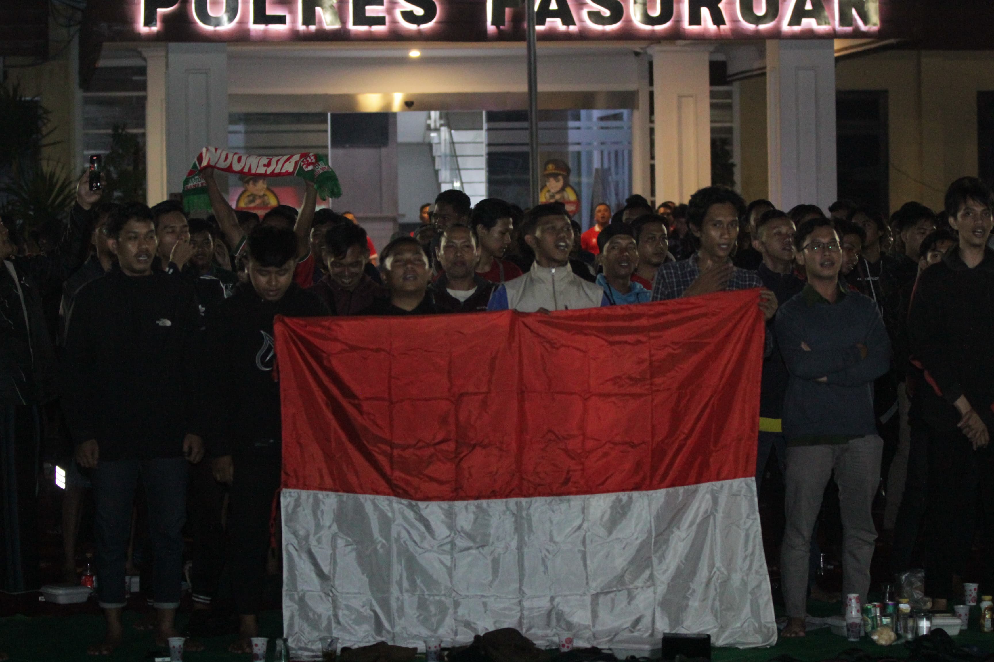 Gemuruh sorak sorai sambil tepuk tangan, loncat loncat dan teriak ucapkan yel yel terdengar ketika babak pertama baru dimulai sampai sepanjang pertandingan merupakan ekspresi suporter Timnas Indonesia saat mendukung timnya, apalagi ketika Rafael struick menciptakan gol ke Gawang Korea Selatan di babak pertama membuat halaman polres Pasuruan bergetar.