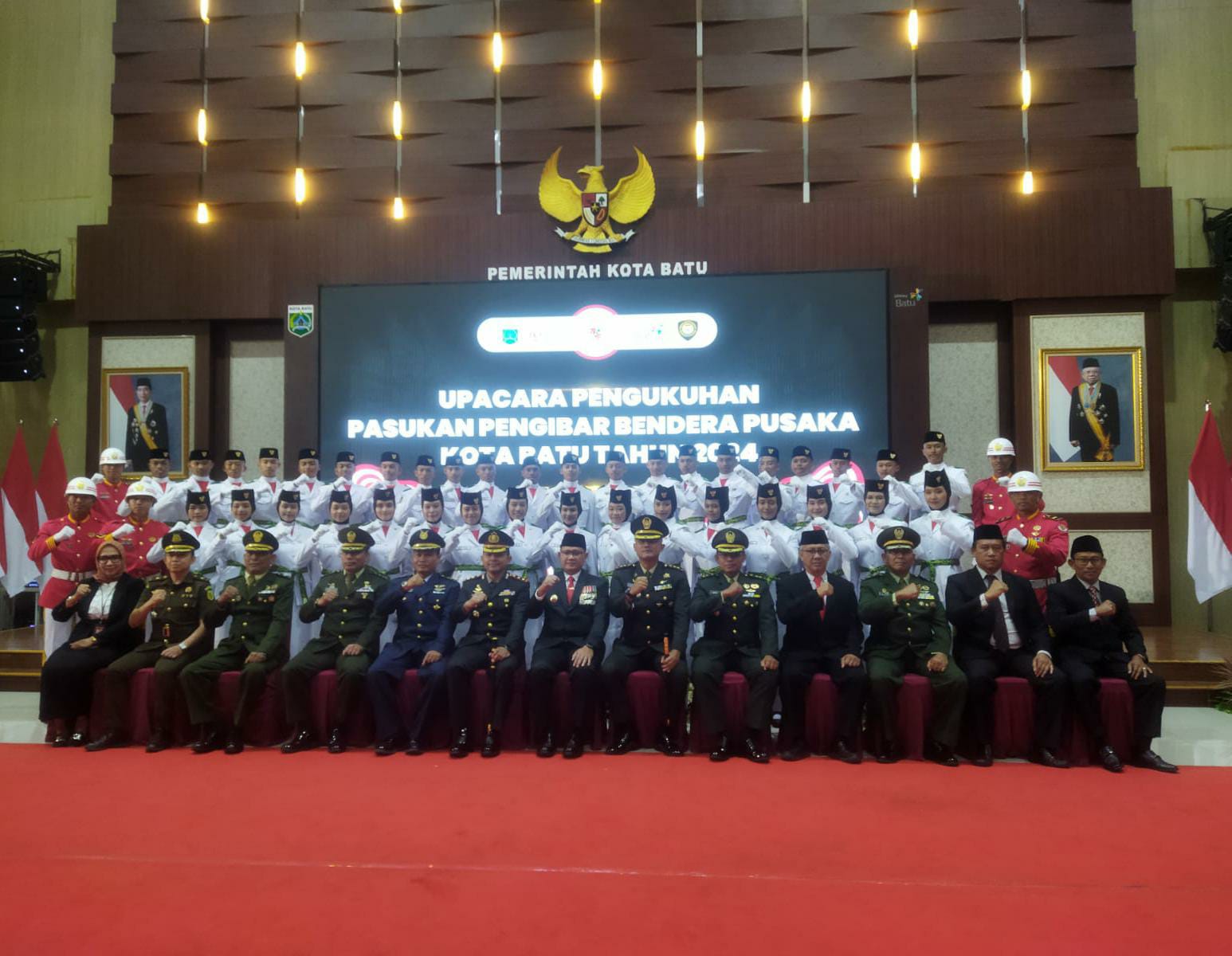 Komandan Kodim (Dandim) 0818/Malang-Batu, Letkol Inf Yuda Sancoyo, M. Han., bersama jajaran Forum Komunikasi Pimpinan Daerah (Forkopimda) Kota Batu menghadiri kegiatan Pengukuhan Pasukan Pengibaran Bendera Pusaka (Paskibraka) Kota Batu Tahun 2024. Acara ini berlangsung di Gedung Graha Pancasila, Jl. Panglima Sudirman, Desa Pesanggrahan, Kecamatan Batu, Kota Batu, 16/08/2024.